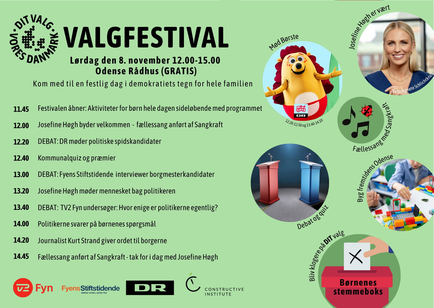 Alle er inviteret og spidskandidater inviteres på scenen til debatter i nye formater og underholdende kommunalquiz. På Valgtovet er der hyggelige aktiviteter for hele familien og rig mulighed for, at borgere og politikere kan tale sammen.